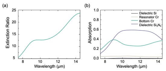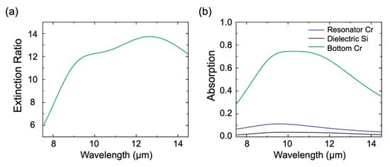 The absorption spectra of the Cr-Si3N4-Si-Si3N4-Cr absorber are shown in Figure 6a-b. From the simulation results, under TM-polarized light, the absorber achieved a high absorption of 87.2% in a broadband wavelength range from 8 µm to 14 µm, covering the entire LWIR atmospheric window. Specifically, there is a 4750 nm bandwidth with an absorptance higher than 90%. As the solid purple line in Figure 6a shows, there are two absorption peaks in the simulated wavelength, located at 9.7 µm and 13.1 µm, respectively, and the corresponding absorptances reach 96.5% and 97.1%. Figure 7a shows the corresponding polarization extinction ratio of the proposed absorber, in which the absorber exhibits a high extinction ratio in a broadband wavelength range from 8 to 14 µm, and the average extinction ratio in the absorber reaches 13.50.