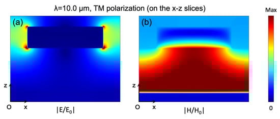 (a) Electric field distribution at absorption peak at 10.0 µm under TM-polarized light; (b) magnetic field distribution at absorption peak at 10.0 µm under TM-polarized light.