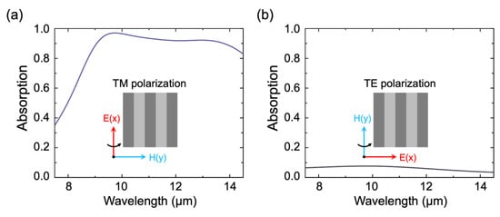 In recent years, absorbers based on metamaterials have been extensively investigated [17,18]. Metamaterial absorbers can selectively absorb incident electromagnetic waves at the nanoscale and modulate key parameters such as the response band, transmittance, and intensity [19,20], breaking through the limitations of conventional absorbers and triggering promising applications in detectors [21], thermal emitters [22], thermal imaging [23,24], and energy harvesting [25]. Previous research investigated the design of various structures to improve absorptance, including metal gratings [26,27], multilayer structures [28,29], nanoparticles [30], nanocubes [21], and nanoholes [31,32]. However, these studies usually focus on broadening the absorption peak and are insufficient for meeting the growing demand of polarization imaging. Conventional polarization imaging technologies pair pixels of an uncooled focal plane array with polarizers and place a 2 × 2 array of polarizers in front of a unit consisting of four pixels (the transmission axis of each polarizer is placed at 0°, 45°, 90°, and 135°) to measure intensity [33]. Nevertheless, additional polarizers make the optical system inevitably complex and bulky, leading not only to high costs but also to the degradation of the detector’s performance. Furthermore, in the long-wavelength infrared (LWIR) atmospheric window of 8000–14,000 nm, there are very few reports on polarization-selective absorbers. Designing an ultra-broadband high-absorption and polarization-selective absorber covering the entire LWIR is consequently necessary.