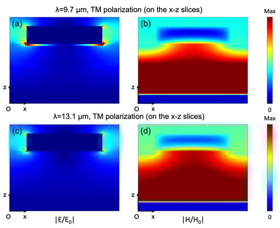 (a) Electric field and (b) magnetic field distribution at absorption peak at 9.7µm under TM-polarized light; (c) electric field and (d) magnetic field distribution at absorption peak at 13.1 under TM-polarized light.