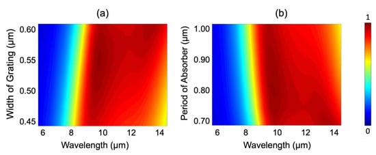 Finally, we evaluated the influence of the microstructure period tolerance on the absorption characteristics with respect to its manufacturing. With the development of microfabrication technologies, metamaterials can usually be fabricated by film deposition, photolithography, and ion-beam etching, among other techniques. Specifically, the multilayer structure of the proposed metamaterials can be prepared by magnetron sputtering or electron beam evaporation, while the upper grating array can be prepared by existing nanoprocessing methods, such as electron beam lithography (EBL) and nanoimprinting. These methods are capable of efficient mass production, but a considerable loss of absorber performance due to minor processing errors is inevitable. Here, the spectral stability of the designed absorber was evaluated, as shown in Figure 9. We analyzed the influence of geometric parameters on the performance of the proposed absorber. Whether the width of the grating changes (from 450 to 600 nm) or the period of the microstructure changes (from 700 to 1000 nm), the absorber possesses remarkably spectral stability. In this way, the loss of performance in manufacturing can be avoided to the maximum extent, signifying that our absorbers allow minor processing errors in fabrication and enable the performance to be stably maintained.