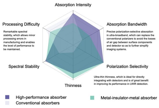 In order to further demonstrate the excellent performance of the metamaterial absorber designed in this paper, we performed a rough performance assessment, as shown in Figure 10. By comparison, our high-performance metamaterial absorber exhibits the following characteristics: (a) precise polarization-selective absorption in ultra-broadband, which can replace conventional polarizers to avoid the losses of the air gap between surface components and the detector so as to further simplify imaging systems; (b) ultra-thin thickness, which is ideal for directly integrating with detectors and is of great benefit in improving its performance in LWIR detection; and (c) remarkable spectral stability, which allows minor processing errors in manufacturing and enables the performance of the absorber to be maintained. Accordingly, the proposed absorber has great application potential in the future.