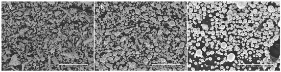 The EP, WA, and GA powders were fabricated through EP, gas-assisted WA, and inert GA, respectively. The powder size distributions and morphologies are reported to have effects on the velocity and temperature of powder feedstocks upon impact substrates [8,15,26,27,28]. The results for the powder size distributions of these three Cu powders are listed in Table 1, revealing that the WA powder had the smallest powder size. SEM-attained morphologies of the EP, WA, and GA powders are presented in Figure 1a–c, respectively. The morphology of the EP powder (Figure 1a) exhibits a dendritic structure and irregular shape; by contrast, the WA (Figure 1b) and GA (Figure 1c) powders have near-spherical and spherical shapes, respectively.