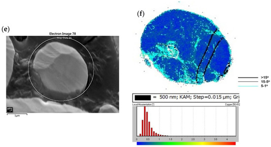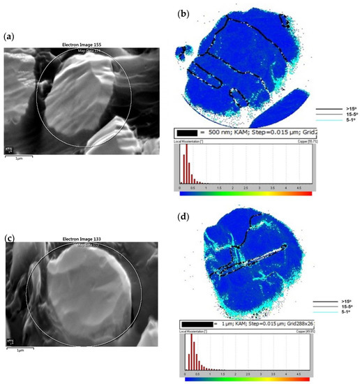 The annealed Cu powders were also analyzed by EBSD. The SE images and the corresponding areas analyzed through the EBSD KAM + GB mapping of the annealed EP, WA, and GA powders are presented in Figure 3a–f, respectively. The recrystallization and grain growth phenomena of the annealed Cu powders were assessed by comparing the KAM + GB maps of the annealed Cu powders with those of the original powders (see Figure 2b,d,f and Figure 3b,d,f). The KAM + GB maps presented in Figure 3b,d,f reveal that the local misorientations with high angles of 0.8–2.6° (the green area) almost disappeared. These maps also reveal that the strain release in the grains, as indicated by the blue area (<0.8°) and the presence of low-angle (1–5°) grain boundaries. The aforementioned phenomena are not observed in Figure 2b,d,f, in contrast to the annealing effect. The recrystallization of Cu into a twin-grain structure has been reported by other studies [31,32,33], and this phenomenon is also observed in the annealed EP and GA powders (Figure 3b,f) examined in the present study. However, the grains of the annealed WA powder were not recrystallized into a twin-grain structure but into equiaxed grains instead. The amount of local misorientation with angles of >1.5° within the grains of the annealed EP, WA, and GA powders was also calculated and is presented as percentage values in accordance with the respective KAM legends in Figure 3b,d,f. Table 1 also lists the analysis results, revealing that the changes in the >1.5° misorientation (presented as percentage values) within the grains of the EP, WA, and GA powders before and after annealing were 2.3% to 0%, 0.5% to 0.3%, and 2.3% to 0%, respectively. The plastic microstrain remaining in the original Cu grains (Figure 2b,d,f) was released after annealing through recrystallization and grain growth (Figure 3b,d,f). The twin boundaries exhibited by the annealed EP and GA powders may influence powder plasticity [33].