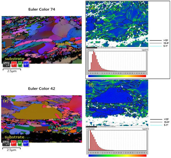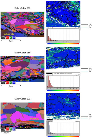 The EBSD Euler contrast and KAM + GB maps of the cold-sprayed AEP, AWA, and AGA coatings made from the annealed EP, WA, and GA powders are presented in Figure 5a–f, respectively. The percentages of misorientations with angles of >1.5° within the grains of the AEP, AWA, and AGA coatings were also calculated on the basis of the KAM + GB maps in Figure 5b,d,f, respectively, and the results are listed in Table 2. Notably, the Euler contrast maps in Figure 5a,c,e reveal that the cold-sprayed AEP, AWA, and AGA coatings generally exhibit well-recrystallized grains and strain release even after intensive deformation upon impact; furthermore, this phenomenon is most prominent in the AGA coating. The percentages of misorientations with angles of >1.5° within the grains in the AEP (0.7%), AWA (0.5%), and AGA coatings (0%) were low (Table 2); this finding is consistent with the occurrence of well-recrystallized grains in the Euler contrast maps of the AEP (Figure 5a), AWA (Figure 5c), and AGA (Figure 5e) coatings and the lower hardness of the AEP, AWA, and AGA coatings relative to the OEP, OWA, and OGA coatings (Table 2).