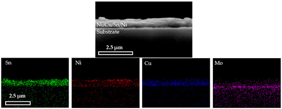 For the synthesis of the CNTSSe films, Ni/Cu/Sn/Ni precursors with elemental compositions such as Cu—15.9 at.%, Sn—20.5 at.%, and Ni—63.6 at.% with a total thickness of 700–900 nm were used (Figure 1). The EDX mapping images of the cross-section of the precursors in Figure 1 showed mutual diffusion of the deposited metals, which may indicate the formation of binary and/or ternary intermetallic compounds [21,24]. For example, it was noted in [25] that the Cu6.26Sn5 (or Cu6Sn5) phase in the Cu–Zn–Sn electrodeposited precursors could form at room temperature. Copper and nickel are completely miscible in both the liquid and solid states [26]. Cu–Ni alloys crystallize over the whole concentration range [26]. In addition, the observed diffusion confirmed good adhesion between the deposited metal layers as well as to the substrate. Nevertheless, two regions could be distinguished on the EDX mapping image of Ni (Figure 1), where Ni diffused throughout the thickness of the precursor (right image area) and two Ni layers were visible (left image area): a sublayer and a top layer.