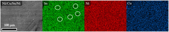 - The Ni/Cu/Sn/Ni precursors had a uniform distribution of the deposited metal layers. The EDX mapping images showed a mutual diffusion of sequentially applied elements, which may indicate the formation of a binary or ternary intermetallic compound in the precursors.