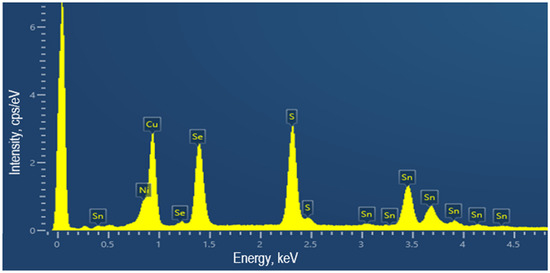 The elemental composition of the synthesized CNTSSe films is presented in Table 1. The elemental composition of the films was close to the stoichiometric ratio. However, the Cu/(Ni + Sn) and Ni/Sn ratios indicated a deficiency of copper and nickel in the films. In addition, the films were enriched in chalcogen (chalcogen/metal ≈ 1.3). The EDX spectrum of the synthesized CNTSSe films indicated the absence of impurity elements, particularly oxygen, in their composition (Figure 3).