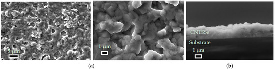 Figure 4 shows typical SEM images of the surface and cross-section of the CNTSSe thin films. As can be seen (Figure 4a), the surface of the film was a homogeneous structure without cracks and with densely packed faceted crystals and single pores. The size of the crystals on the surface of the films was greater than one micron, which agglomerated in large grains. Large crystals in the form of stretched petals upward surrounded the pores on the surface of the film. From the cross-sectional images (Figure 4b), the thickness of the films was about 2.4 μm. This value was three times the thickness of the Ni/Cu/Sn/Ni precursors due to the insertion of S and Se atoms in the crystal lattice.