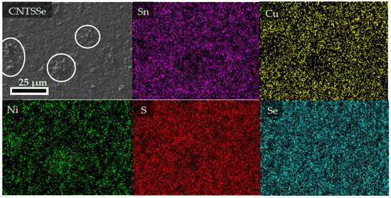 The EDX mapping images of the CNTSSe films showed that the small grains clustered (highlighted in white) on the surface of the films were Ni-rich, Sn-, Cu-, and S-poor while Se was distributed evenly over all of the investigated surfaces (Figure 5). Nevertheless, all constituent elements had a uniform distribution over the surface of the film.