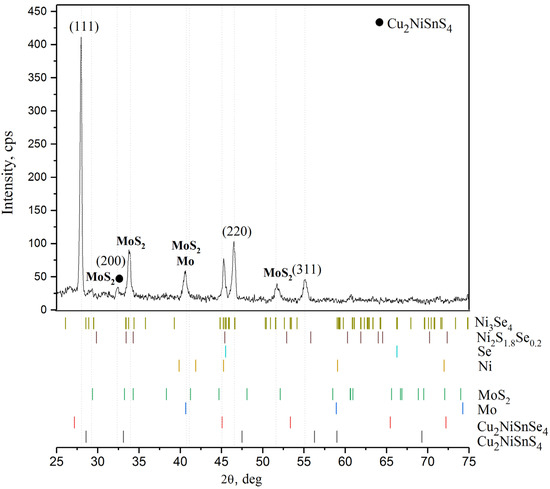 The X-ray diffraction patterns of the CNTSSe films contained a reflection at 2θ ≈ 45.31°. This peak was not associated with CNTSe and its identification was difficult. Nevertheless, this peak probably belongs to the hexagonal Ni (COD no. 96-901-3008), cubic Se (COD no. 96-901-3135), hexagonal Ni2S1.8Se0.2 (COD no. 96-153-8792), or monoclinic Ni3Se4 (COD no. 96-900-9245) phase. Taking in account the synthesis conditions and the obtained results of EDX mapping images of the CNTSSe films (Figure 5), we can rule out the presence of the pure nickel phase. According to the Crystallography Open Database, the most intense peak from cubic Se (no. 96-901-3135) is at 2θ ≈ 45.45°. While for hexagonal Ni2S1.8Se0.2 (COD no. 96-153-8792) and monoclinic Ni3Se4, the most intense peak is at 2θ ≈ 34.24° and 33.37°, respectively. This may disprove the existence of these phases in the composition of the CNTSSe films. However, according to the COD, the diffraction peak from Ni2S1.8Se0.2 at 2θ ≈ 45.34° is the second in intensity and from Ni3Se4 at 2θ ≈ 45.18° is the third in intensity in diffraction patterns. According to the COD, the strong MoS2 peak is at 14.5°, and the peak at 40.48° should be more intense than at 33.8°. Considering this, we can conclude that the contribution from the Ni2S1.8Se0.2 or Ni3Se4 phase increases the intensity of the peak at 2θ ≈ 30.8° compared to the peak at 40.48° belonging to MoS2 and Mo. The contribution from the MoS2 phase increases the intensity of the peak by about 45°. This may confirm the formation of the hexagonal Ni2S1.8Se0.2 or monoclinic Ni3Se4 phase. In addition, the asymmetric broadening of the peaks at 33.8° and 51.7° may indicate the existence of the Ni3Se4 phase along with MoS2. In [36], the fabricated nickel foam alloys on the carrier Ni3Se4 and Ni3S2 were doped with sulfur and selenium, respectively, using a light hydrothermal anion exchange reaction. The samples had a similar surface morphology to the CNTSSe films synthesized in this work. The presence of other impurity phases, for example, Cu(S,Se), Sn(S,Se), and Cu2Sn(S,Se)3, in the synthesized CNTSSe films was not found.