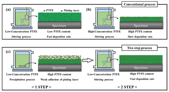 In this new technique, the electroless Ni-P-PTFE composite plating is realized by continuous precipitation and stirring steps, unlike the conventional approach. In the first step, the high-carbon steel specimen was placed in the same plating solution for 20 min, which induced excessive co-deposition of the PTFE particles onto the specimen surface. Next, while stirring the solution, the specimen was further coated by a nickel matrix with embedded PTFE particles (20 min), which significantly increased the degree of PTFE adhesion. This method is shown in Figure 1c. a and b are the conventional methods using only stirring at various concentrations.