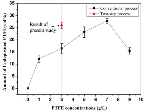 PTFE content in the Ni-P-PTFE plating layer for various PTFE concentrations and the two processes compared herein.