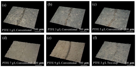Plating thicknesses for various PTFE concentrations and methods: conventional process; (a) 1 g/L, 5.68 μm, (b) 3 g/L, 3.45 μm, (c) 5 g/L, 3.11 μm, (d) 7 g/L, 2.66 μm, (e) 9 g/L, 2.13 μm, two-step process; (f) 3 g/L, 3.44 μm.