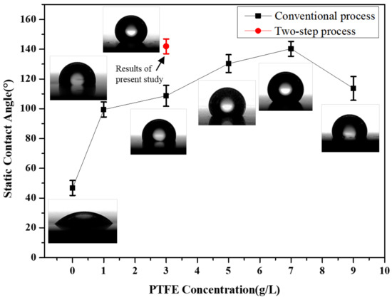 A notable characteristic of PTFE is its low surface energy. Adding PTFE particles to the Ni-P plating layer can improve its wetting properties. When the PTFE concentration in the plating bath was high, the PTFE content in the plating layer increased. The higher the PTFE concentration in the plating bath, the better the wetting characteristics and the superhydrophobicity [30]. Figure 7 presents the results of the static contact angle on the surface of the plating layer. The static contact angle of the Ni-P plating layer that did not contain PTFE was 46.8°. The experimental results show that the greater the PTFE content in the plating bath, the larger the contact angle, although when the PTFE concentration reached 9 g/L, the contact angle decreased. The co-deposition rate was reduced owing to the agglomeration of PTFE particles in the plating bath. The static contact angle of the layer plated by combined precipitation and stirring at a PTFE concentration of 3 g/L was 141.9°, which is substantially high. Notably, excellent hydrophobic properties were exhibited even when plating was performed in a low-PTFE-concentration plating bath. The relationship between the PTFE content in the plating layer and the contact angle can be confirmed by observing Figure 3 and Figure 7. Namely, the PTFE content in the plated layer and the static contact angle are proportional.