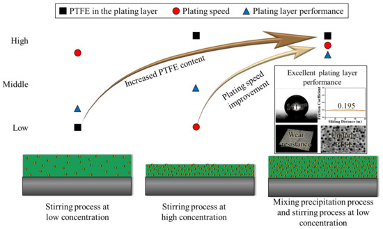 In summary, as shown in Figure 8, when only the stirring process was used with low-concentration PTFE, the content of PTFE in the plating layer was low. When only stirring was used with high-concentration PTFE, the plating speed was lowered further, and the PTFE particles in the plating layer were agglomerated. However, if the precipitation and stirring processes were combined at a low PTFE concentration, high PTFE content was observed in the plating layer, along with a relatively high plating speed and prevention of particle agglomeration. As a result, high hydrophobicity, low coefficient of friction, excellent wear resistance, and uniform plating were achieved.