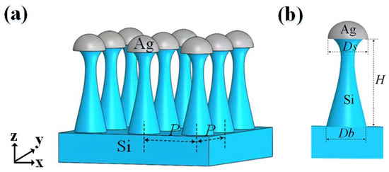 Moreover, Figure 1b shows the 2D unit cell view of the proposed nanostructure with Ag NPs. The main structural parameters of the unit cell are the period of the structure P, the Ag NP diameter Ds, the height H, and the bottom diameter Db of the waist-shaped nanostructure.