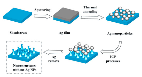 The expected mushroom-nanostructures were prepared with metal annealing and ICP processes. The process diagram of the nanostructure preparation is shown in Figure 2. First, the Si samples were cleaned by the Radio Corporation of America (RCA) process, and a 50-nm-thick Ag film was deposited on the substrates via sputter coating (Alliance Concept, DP650, Annecy, France). Thereafter, the samples were placed in a muffle furnace for rapid thermal annealing at 350 °C for 3 min, thereby forming a mask of Ag NPs. Then the nanostructures were prepared using Ag NPs masks via an ICP process. The etching parameters were maintained at 300 W and 20 W of upper source and lower electrode power, respectively. A mixture of 30 sccm CHF3 and 10 sccm SF6 was used as the etching gas at a pressure of 0.5 Pa for 80 s. In addition, the samples without Ag NPs were obtained by removing residual Ag NPs with an etching solution.