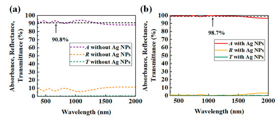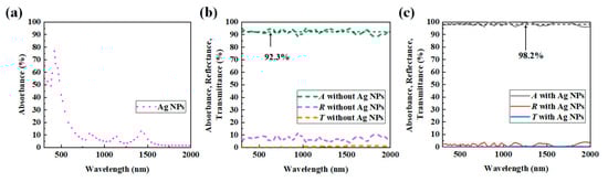Moreover, optical reflectance (R) and transmittance (T) were measured using a universal scanning spectrophotometer, and the absorbance (A) was calculated as A = 1 − R − T. Figure 5 shows the measured reflectance, transmittance, and absorbance spectra of the nanostructured Si metasurface without and with Ag NPs after the ICP etching process. At wavelengths greater than 1400 nm, the nanostructured Si metasurface without Ag NPs showed absorbance values less than 90%, while the average reflectance was higher at approximately 9%, as shown in Figure 5a. Consistent with the simulated results, the absorption of the nanostructured Si metasurface with Ag NPs also significantly improved. The average absorption was 98.7% in the wavelength range of 400–2000 nm, as shown in Figure 5b, showing a near perfect broadband absorption effect.