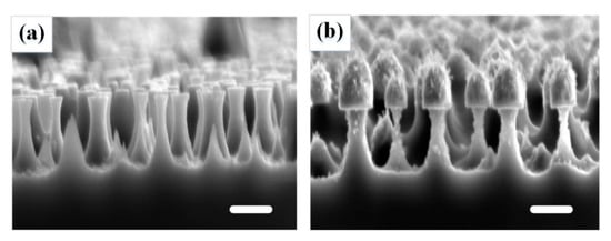 Cross-sectional SEM images of the nanostructures (a) without Ag NPs and (b) with Ag NPs after the ICP process. Scale bar corresponds to 500 nm.