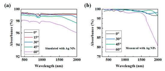 To verify the performance of the large-angle superabsorption on the fabricated nanostructured Si metasurface with Ag NPs, the angle-dependent absorption spectra were measured at different incident angles from 0° to 60°, as shown in Figure 6b. In general, as the angle of incidence (AOI) increased, the absorption band narrowed. When the AOI was increased from 0° to 45°, the average absorbance of the surface with Ag NPs was 98.7%, 99.1%, and 99.3%, respectively. The nanostructures exhibited near-perfect superabsorption with increasing AOI. However, in the case of 60° AOI, the absorption of the nanostructures decreased at wavelengths above 1600 nm; this may have been because the energy of the structure with Ag NPs was mainly concentrated on the upper position of the structures when the wavelength was greater than 1600 nm, and the energy was easily radiated into the air in this mode. Thus, the proposed structure is suitable for broadband and wide-angle absorption applications, which providing large angle detection and measurement for optical systems in atmospheric and remote sensing.