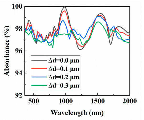 Firstly, the effect of random diameters of Ag NPs on the optical properties of Si metasurfaces was investigated, and the reference diameter Ds, height H and period P were set to 0.5 μm, 0.9 μm and 0.8 μm, respectively. In order to simulate the random structures in FDTD, the periodic arrangement of the structure array was replaced by the random diameter arrangement, the variation in the diameters of Ag NPs within each unit cell was set as the deviation value Δd, and Δd is set as 0 μm, 0.1 μm, 0.2 μm, and 0.3 μm, respectively. For example, when Δd = 0.1 μm, the diameter selection range of the Ag NPs was 0.5 μm ± 0.1 μm. Figure 7 shows the absorbance curves of different diameter deviation values Δd as a function of wavelength. It can be seen that when Δd was less than 0.2 μm, the absorbance of the structures was less affected, which was similar to the periodic structures (Δd = 0 μm). However, when Δd = 0.3 μm, the absorbance of the structures decreased significantly. This was because, with the increase in diameter fluctuation, the volume of the Ag NPs changed significantly, which changed the resonance mode between Ag NPs, and the light coupled into the structure decreased.