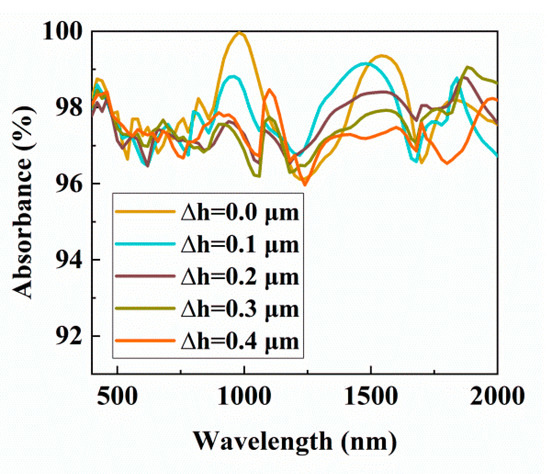 Similarly, Figure 8 depicts the absorbance curves of different structural height deviation values Δh as a function of wavelength. Δh was chosen as 0 μm, 0.1 μm, 0.2 μm, 0.3 μm, and 0.4 μm, respectively. We can observe that Δh was negatively correlated with the absorption rate; that is, the larger the variation of Δh, the smaller the absorbance of the random structures. When Δh = 0.4 μm, the average absorbance of the random structures was reduced to 97.3%. Moreover, compared with the periodic structures (Δh = 0 μm), with the increase in the height deviation value Δh, the resonance peak also changed, resulting in a red-shift phenomenon. This may have been because with the increase in Δh, if the structure as subdivided into N layers, the refractive index of each layer was no longer a smooth gradient change, resulting in enhanced reflection of incident light and reduced absorption.