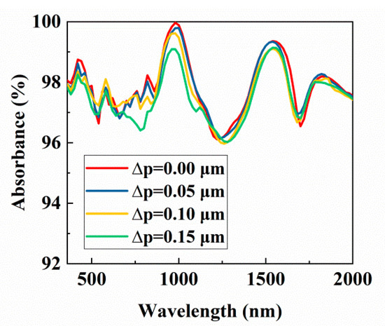 In addition, the effect of different positional deviation values Δp on Si metasurface absorption is shown in Figure 9. It can be seen that the change of Δp barely changed the incident light absorbance of the random structures. Only when Δp = 0.15 μm, the absorption of the structure decreased slightly around the wavelength of 1000 nm. For changes in Δp, the average period of the structures was constant for the entire simulated array, since each structure was displaced within its own unit cell. Therefore, when Δp fluctuated within a certain range, the absorption effect of random arrays and periodic arrays on the Si metasurface was consistent.