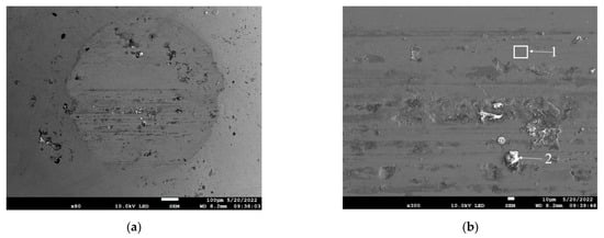 Figure 9 shows the worn area of the grinding ball after the wear test. It can be seen that a small platform appears on the grinding ball (Figure 9a), suggesting that the grinding ball also underwent certain wear during the wear test. Furrows also appeared on the worn area of the grinding ball, which indicates the grinding ball underwent abrasive wear during the wear test. EDS analysis shows that the elements of region 2 contained a high oxygen content (Figure 9b,d) and the W element was detected on the worn area of the grinding ball (Figure 9d), which indicates that abrasive wear, oxidative wear and adhesion wear occurred on the grinding balls during the wear test.