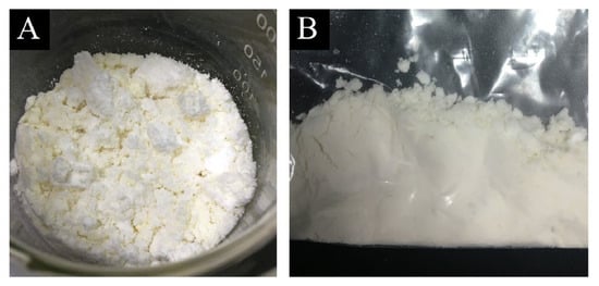 (4) Microencapsulation: the wall material was slowly poured to the core material, and the citric acid monohydrate was added one by one at the speed of 300 r/min. After being stirred until completely dissolved, the pH test paper was used to test the pH value until the value was 2.5–3.0. Then the temperature was slowly raised to 70 °C, and the reaction lasted for 3 h. The resulting substance was filtered by suction and then put into a drying oven at 80 °C for 4 h and then ground. As shown in Figure 2, the obtained powder were the prepared microcapsules, which were light yellow white.
