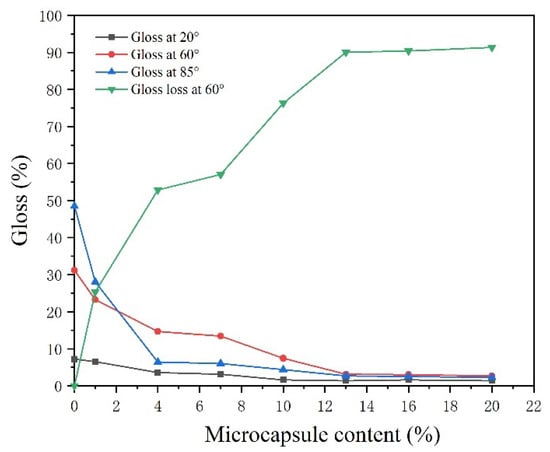 The effect of microcapsules with different content on the gloss of the coatings is shown in Table 5 and Figure 7. With the increase of microcapsule content, the gloss of the coatings gradually decreases and the gloss loss rate gradually increases. When the microcapsule content is 0%–4.0%, the gloss is high. When the microcapsule content is 4.0%–10.0%, the gloss of the coating decreases significantly. When the content of microcapsules is 13.0%–20.0%, the decrease of the gloss tends to be gentle. This is because the smoothness and roughness of the coating surface will affect the gloss of the coating. When there are more microcapsules in the coating, the microcapsule particles will reduce the surface flatness of the coating, thereby reducing the light reflection ability of the coating, so the gloss of the coating will decrease and the light loss rate will increase.