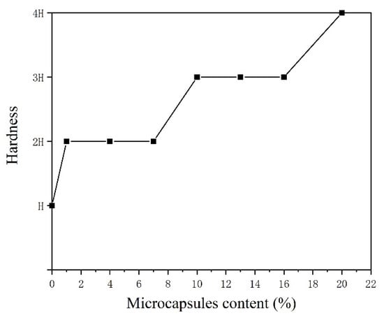According to the standard of GB/T 6739-2006 [40], the hardness of the paint film was tested with a portable paint film hardness tester. The wooden rod part of the pencil top was cut off, and the pencil lead was exposed for about 3 mm and placed for use. The boards were placed flat on the console, and the pencil was at an angle of 45° to the surface of the boards. The pencil was pushed on the surface of the paint film, and the pencil hardness that cut the surface of the paint film was the surface hardness of the paint film. By repeating the above experiments, the surface hardness of the paint films with different microcapsule content was measured respectively.