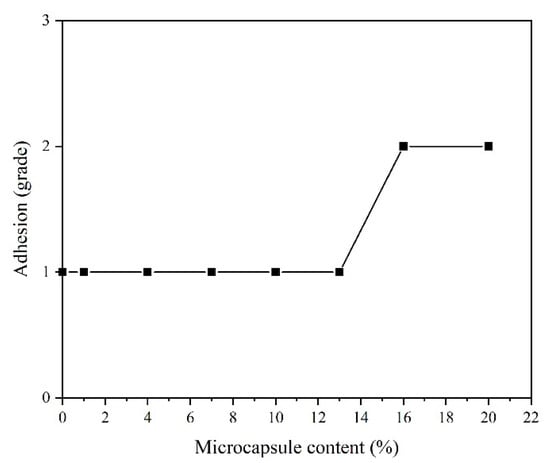 The coating adhesion test results are shown in Figure 9. When the content of the microcapsules is 0%–13.0%, the adhesion of the coatings is basically unchanged. When the content increases to 16.0%–20.0%, the adhesion of the coatings decreases significantly and the adhesion grade increases. This is because when there are many microencapsulated particles in the coating, the binder content in the coating decreases, and the adhesion to wood decreases, resulting in the reduction of adhesion.