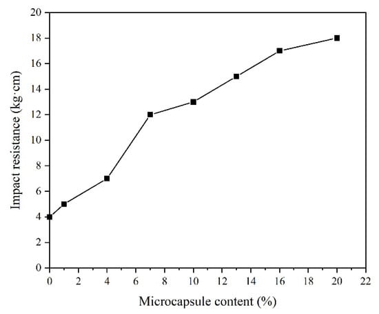 The impact resistance test result of the coatings is shown in Figure 10. The impact resistance of the coating is directly proportional to the content of the microcapsules, which indicates that the impact resistance of the coating surface can be increased by adding microcapsules into the waterborne coating. The impact resistance of the coating without microcapsules is 4.0 kg·cm. When the microcapsules were added to 7.0%, the impact resistance was significantly enhanced, which is 12.0 kg·cm. When the microcapsule content is 20.0%, the impact resistance of the coating is the best, which is 18.0 kg·cm. This is because the composition of the microcapsules is that the wall material covers the core material, and the wall material can play a certain protective function on the core material. When the coating surface is subjected to external force, the microcapsules can form a force layer to disperse the force on the buffer coating, so as to improve the impact resistance of the coating.