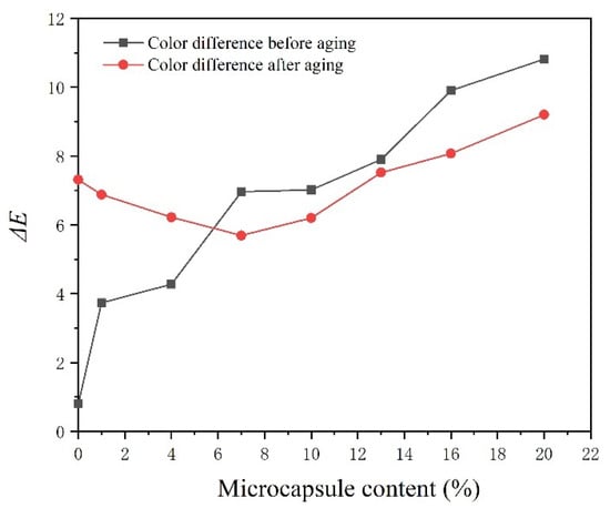 Effect of the microcapsule content on color difference of the coatings before and after aging.