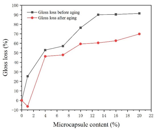Effect of the microcapsule content on gloss loss of the coatings before and after aging.