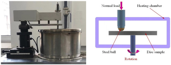 To investigate the tribological behaviors, the experiments were carried out on a ball-on-disc type tester (HT-1000, Zhongke Kaihua Technology Development Co., Ltd., Lanzhou, China) against the AISI 52100 steel balls with a diameter of 5 mm and microhardness of 780 HV. The tester with a load of 1.5–20 N, a rotation speed of 5–2800 rpm and a temperature of room temperature—1000 °C and schematic diagram are shown in Figure 2. The friction coefficient was automatically obtained during the experiment by the tester. The dry wear experiments were performed at a rotation speed of 400 rpm, a radius of 6 mm, a load of 2 N, a temperature of 100 °C and a time of 10 min based on the purpose of the experiment and pre-experimental analysis. The wear mass loss was obtained by using an electronic balance with an accuracy of 0.1 mg and a weighing capacity of 200 g (FA2204C, Shanghai Yueping Scientific Instrument Co., Ltd., Shanghai, China). The wear rate, WR, was then calculated by the formula WR = ΔW/PS, where ΔW is the wear mass loss (mg), P is the normal load (N) and S is the sliding distance (m). Before and after each test, the samples were ultrasonically cleaned using deionized water for 5 min. At least three tests were completed for each condition.
