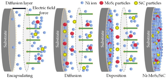 To better illustrate the electrodeposition mechanism of coating particles, the electrodeposition process of the Ni-MoS2/SiC composite coating is shown in Figure 5. The dispersed SiC and MoS2 particles in the plating solution are wrapped by Ni ions through weak adsorption, which causes the particles to be transported towards the cathode (aluminum alloy substrate) under electric field forces due to their positive charge. Afterwards, the charged particles pass through the boundary layer and gradually diffuse to the cathode surface. The particles are then adsorbed on the surface of the aluminum alloy substrate to achieve electrodeposition. In the continuous electrodeposition process, the particles in the diffusion layer on the surface near the cathode are continuously reduced. The continuous magnetic stirring effect can cause the charged particles to transfer to the diffusion layer by migration and diffusion, thus ensuring continuous electrodeposition.