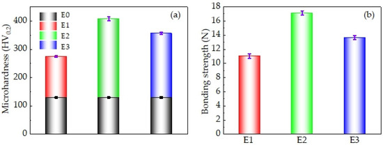 Mechanical properties of E0, E1, E2 and E3 samples. (a) Microhardness; (b) bonding strength.