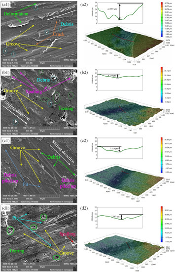 The SEM images and 3D morphologies of worn surfaces of all samples are shown in Figure 8. It can be clearly observed that the worn surface exhibits obvious wide and deep grooves along the sliding direction, and there is typical plastic deformation and plastic flow, which is mainly due to the lower hardness of the 2218 aluminum alloy substrate. Likewise, a few microcracks and debris are present. The worn surface is much rougher, and the wear depth is 22.690 μm, as shown in Figure 8(a1,a2). The E0 sample exhibits typical severe adhesive wear and abrasive wear. However, the worn surface characteristics of all composite coatings are significantly different from that of the 2218 aluminum alloy substrate. As shown in Figure 8(b1,b2), the worn surface of the E1 sample is smoother and has the characteristics of smear wear, with very shallow and fine grooves distributed along the sliding direction. The wear depth is 5.230 μm, which is only 23.05% of the E0 sample. It can be assumed that the softer MoS2 is released on the contact surface under the experimental conditions, forming a good lubricating layer and filling the grooves to some extent [57]. Considering the higher surface hardness of the E1 sample, this is the reason why this sample has very good friction reduction and wear resistance properties compared to the E0 sample, which corresponds to the results in Figure 7a,c. In the meantime, it can be observed that there are tiny pieces of debris, tearing and larger flake spalling on the worn surface, which are related to the characteristics of the composite coating. The mild abrasive wear, flake spalling and tearing are the main wear characteristics of the E1 sample. As shown in Figure 8(c1,c2), it can be observed that the worn surface of the E2 sample is relatively rough, with an obvious distribution of continuous relatively deep and wide grooves along the sliding direction. In addition, there are tiny pieces of debris, piled up debris and pits. The shedding of the SiC particles forms pits, and the plowing effect of the shedding SiC particles and hard debris on the worn surface cause the grooves to become deeper. However, the increase in surface hardness of the composite coating significantly reduced the depth of the grooves compared to the E0 sample. The results of Huang et al. [16] also reported similar wear characteristics of Ni-SiC composite coating. The wear depth of the E2 sample is 7.824 μm, which is 34.48% of that of the E0 sample and 1.50 times of that of the E1 sample. It can be concluded that the improved tribological behaviors of the E2 sample are mainly attributed to its increased surface microhardness. The E2 sample mainly exhibited abrasive wear and particle shedding. Compared with the E1 and E2 samples, the worn surface of the E3 sample is smooth and continuous, with relatively obvious distribution of continuous fine grooves along the sliding direction, smaller flakes spalling, pits caused by dislodged SiC particles and tearing of the composite coating. Nevertheless, there are no obvious plastic deformations and debris piled up. The wear depth of the E3 sample is 7.387 μm, which is 1.41 times that of the E1 sample and 94.41% that of the E2 sample. The good tribological properties of the composite coatings mainly depend on the improvement of their surface hardness and the combined friction reduction and wear resistance properties of the coating materials. However, the groove-filling ability of MoS2 is diminished by the plowing effect of the hard particles. The tearing and flake spalling marks are significantly reduced. The E3 sample mainly exhibits mild abrasive wear, tearing and spalling, as shown in Figure 8(d1,d2). Therefore, when the friction reduction and wear resistance are considered together, the E3 sample has better tribological properties, which is consistent with the results of friction coefficient and wear rate in Figure 7.