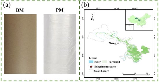 (a) Soil covering materials used in this study. BM, biodegradable paper mulch film; PM, white plastic film. (b) Location of the study area.