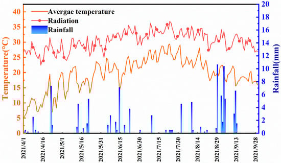 Meteorological radiation, temperature, and precipitation at the experimental site in Hexi arid oasis irrigation area, China. Values collected in the growing season of maize and flax in 2021 are plotted.