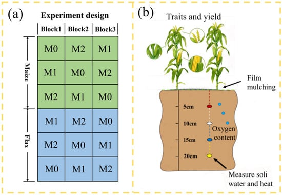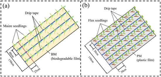 Planting patterns and mulching positions of (a) maize and (b) flax (biodegradable paper mulch film or white plastic mulch film).