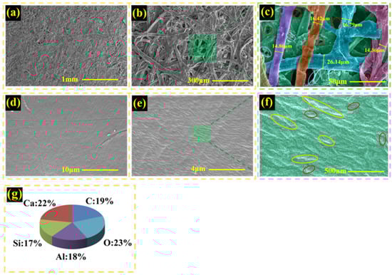 (a–c) SEM images of biodegradable paper film surface at different magnification; (d–f) SEM images of plastic white film surface at different magnification; (g) element content distribution on the surface of BM.