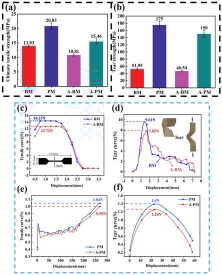 Figure 6a,b show that the tensile strength and tear strength of BM were lower than those of PM, which is consistent with the expectation. Because the main component of PM is polythene, the molecular force between bonding bonds is higher than that between fibers, which gives it higher strain and plasticity. After dry heat aging, the tensile strength of BM decreased by 22%, and the retention rate was 78%. The tear strength decreased by 10%, and the retention rate was 90%. After dry-hot aging, the maximal tensile strength of PM decreased by 26%, and the retention rate was 74%. The tear strength decreased by 14%, and the retention rate was 86%.