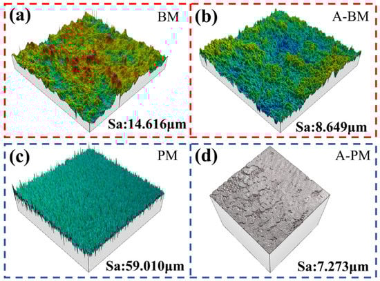 Three-dimensional morphology of (a) BM surface, (b) aged BM surface, (c) PM surface, and (d) aged PM surface.
