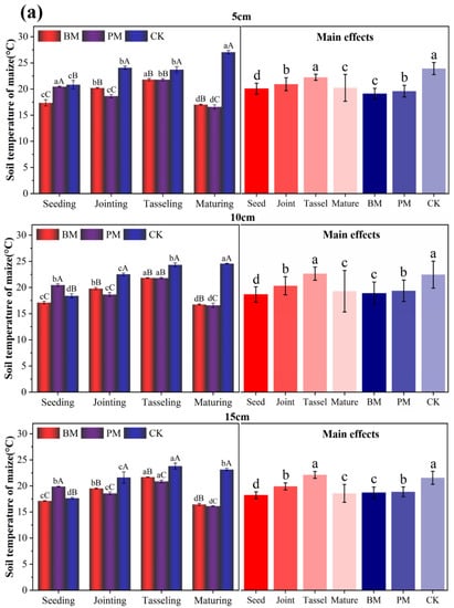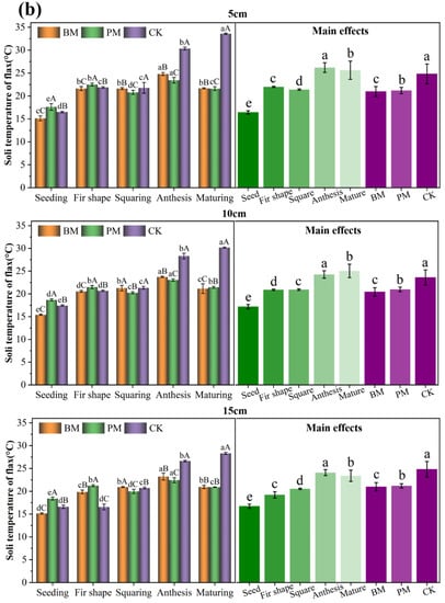 Changes in plastic film mulching on soil temperature in 2021. (a) Soil temperature of maize at 5, 10, and 15 cm depth; (b) soil temperature of flax at 5, 10, and 15 cm depth. Values represent the mean ± standard deviation. Using Duncan’s multiple-range test, different lowercase letters indicate significant differences in soil temperature under different mulching methods at the same growth period (p < 0.05), and different capital letters indicate significant differences in soil temperature at different growth stages under the same mulch control (p < 0.05). BM, biodegradable paper mulch film; PM, white plastic mulch film; CK, not covered with film.