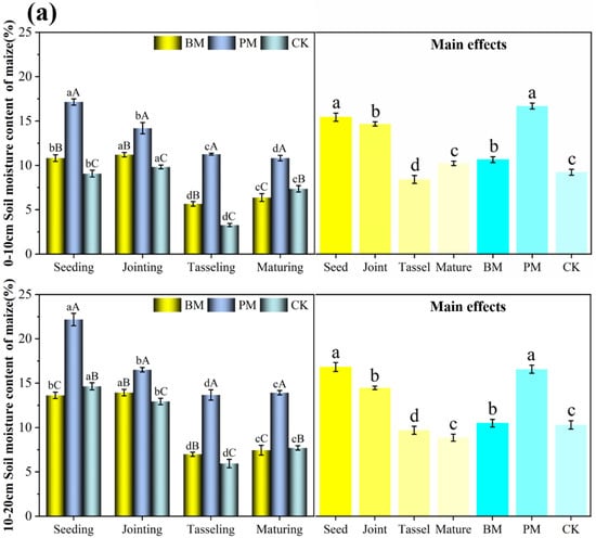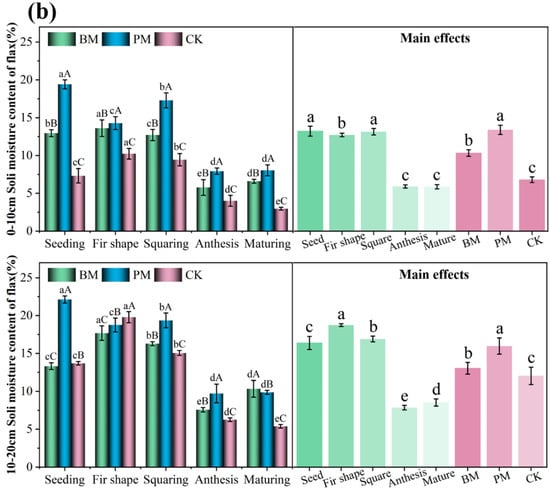 Soil moisture content affected by mulching materials in (a) maize and (b) flax in 2021. Soil depth was 0–10 and 10–20 cm. Values represent the mean ± standard deviation. Using Duncan’s multiple-range test, different lowercase letters indicate significant differences in soil moisture content under different mulching methods at the same growth period (p < 0.05); different capital letters indicate significant differences in soil moisture content at different growth stages under the same mulch control (p < 0.05). BM, biodegradable paper mulch film; PM, white plastic mulch film; CK, not covered with film.