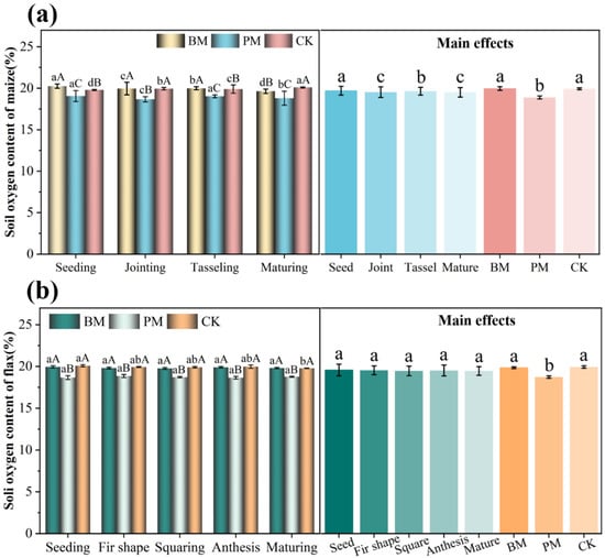 Soil oxygen content affected by mulching materials in (a) maize and (b) flax in 2021. Values represent the mean ± standard deviation. Using Duncan’s multiple-range test, different lowercase letters indicate significant differences in soil oxygen content under different mulching methods at the same growth period (p < 0.05); different capital letters indicate significant differences in soil oxygen content at different growth stages under the same mulch control (p < 0.05). BM, biodegradable paper mulch film; PM, white plastic mulch film; CK, not covered with film.