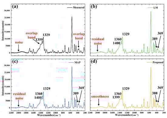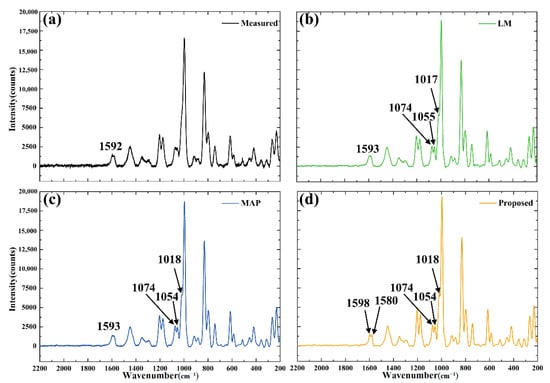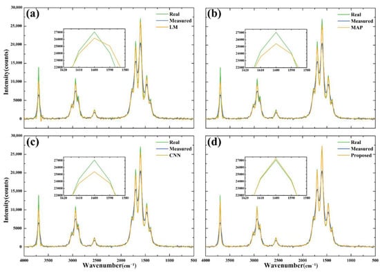 Then, the measured Raman spectrum was reconstructed by the LM method [], the MAP method [] and proposed method. In addition, to show the superiority of the proposed spectral reconstruction method over using a CNN directly, a CNN is also trained with measured Raman spectra dataset and real Raman spectra dataset to estimate the real Raman spectrum. The estimated spectra of the four methods are shown in Figure 3a–d.